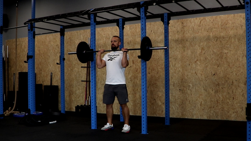 - Powoli opuść sztangę na obojczyki biorąc kolejny wdech by nabrać powietrza do kolejnego powtórzenia.